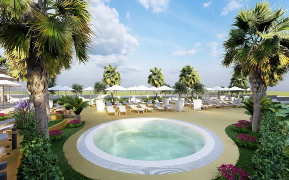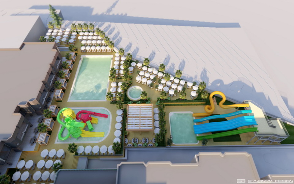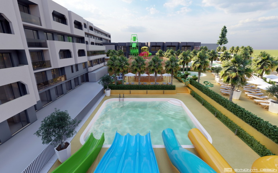 2 външни плувни басейна за възрастни, единият от които ще бъде оборудван с 4 водни пързалки